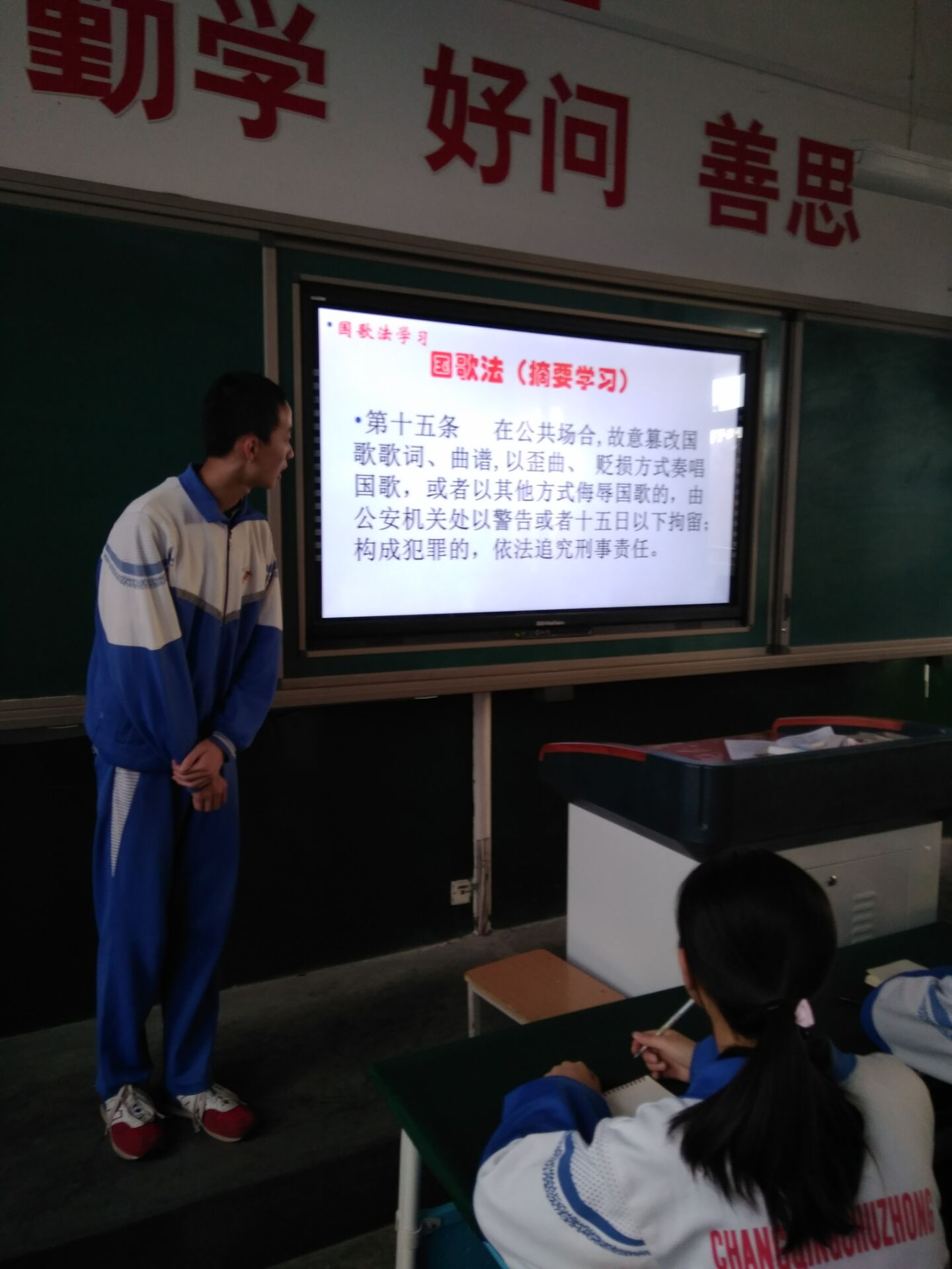 班團(隊)會(huì)上(shàng),在班主任或團支部書(shū)記(中隊長)組織下,同學們了解到了國旗、國歌(gē)的創立背景,升挂國旗、唱(chàng)國歌(gē)的要求,并知道(dào)法律條款中嚴禁對國旗、國歌(gē)做出不恰當、不合理(lǐ)行(xíng)為(wèi)規定。