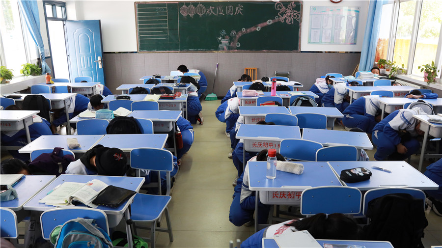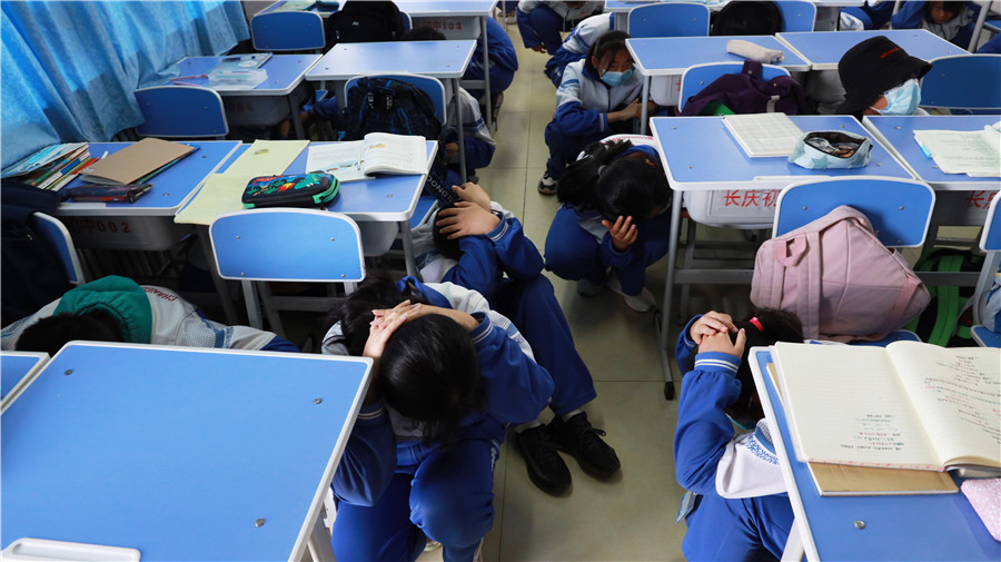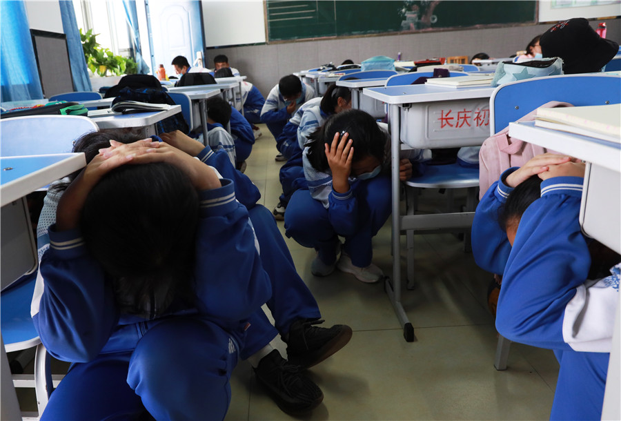 警報突然響起,正在上(shàng)課的同學在老師(shī)的指導下,快速雙手護頭,躲避到課桌下,進行(xíng)緊急避險。