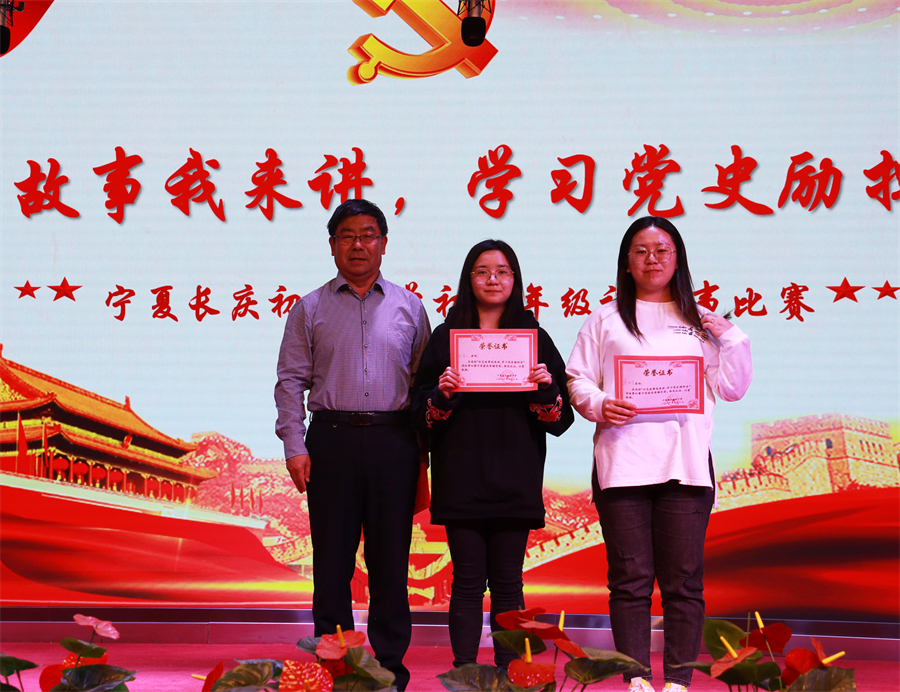 馬玉柱副校長為(wèi)大(dà)賽二等獎獲得(de)者翰沛彤、吳若溪、蘇琪同學頒獎。