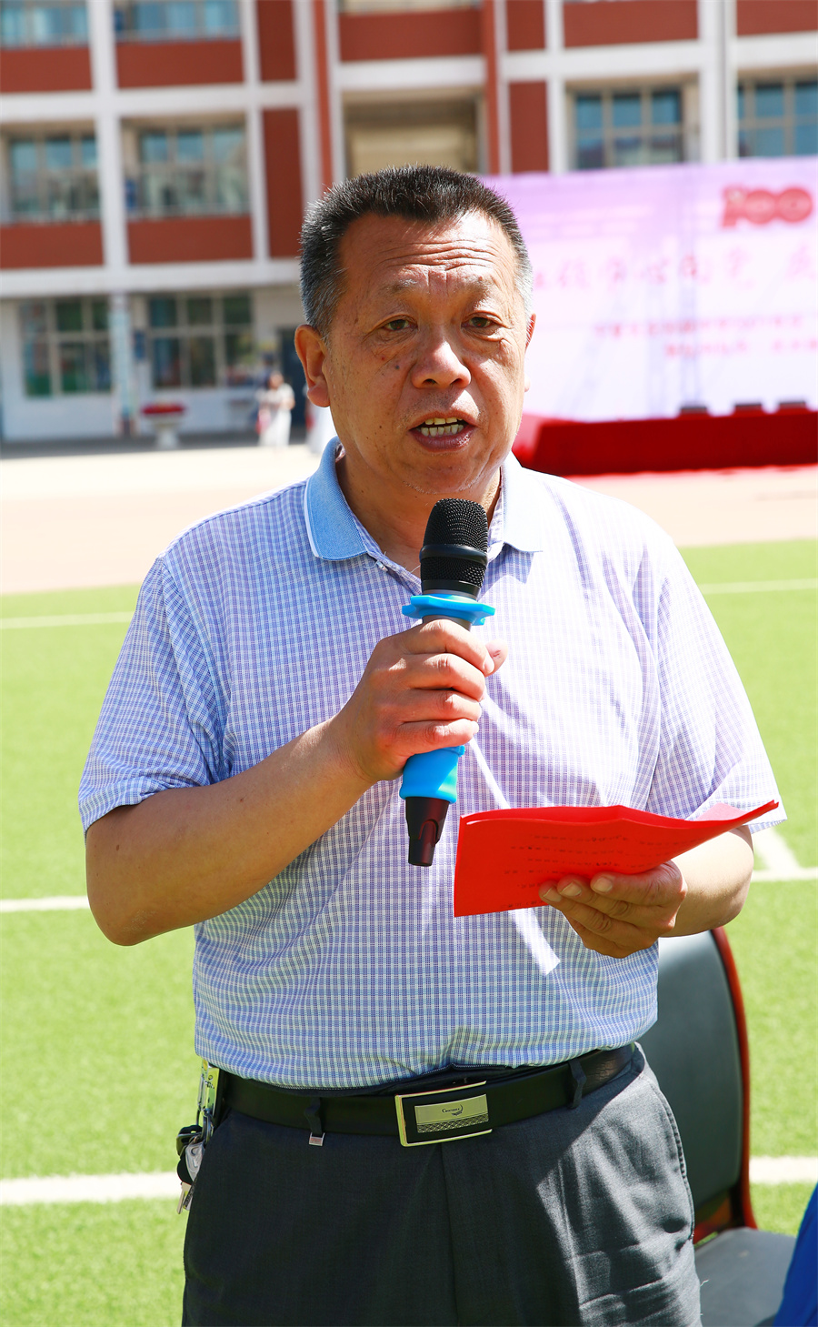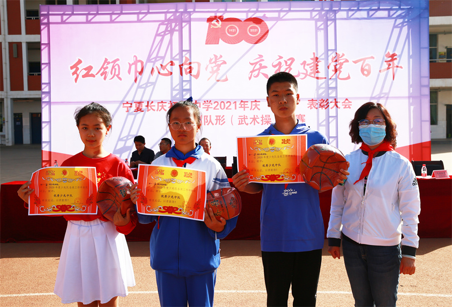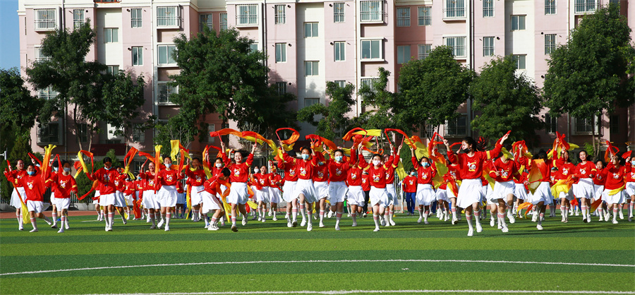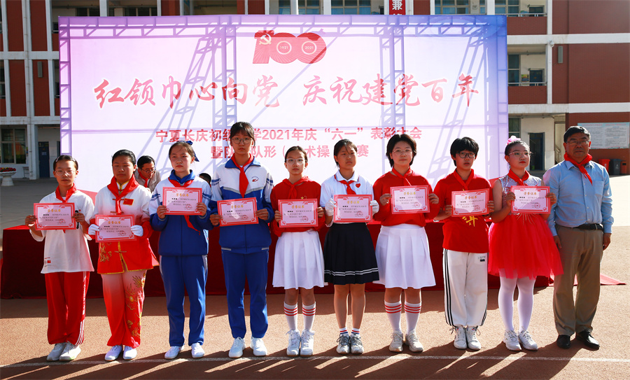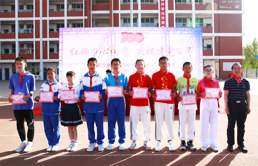在慶祝中國共産黨成立100周年之際,我校隆重舉辦以“學黨史、辦實事”為(wèi)宗旨的慶“六一”系列活動。6月1日上(shàng)午,在學校田徑場(chǎng)舉行(xíng)慶“六一”表彰大(dà)會(huì)暨隊列隊形(武術(shù)操)比賽。大(dà)會(huì)在莊嚴的國歌(gē)聲中拉開(kāi)帷幕。