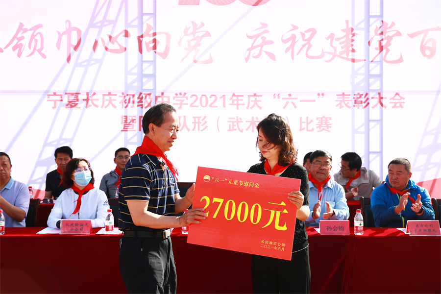 長慶油田公司一直關注和(hé)支持我校的各項工作。圖為(wèi)油田公司代表向我校贈送慰問金。