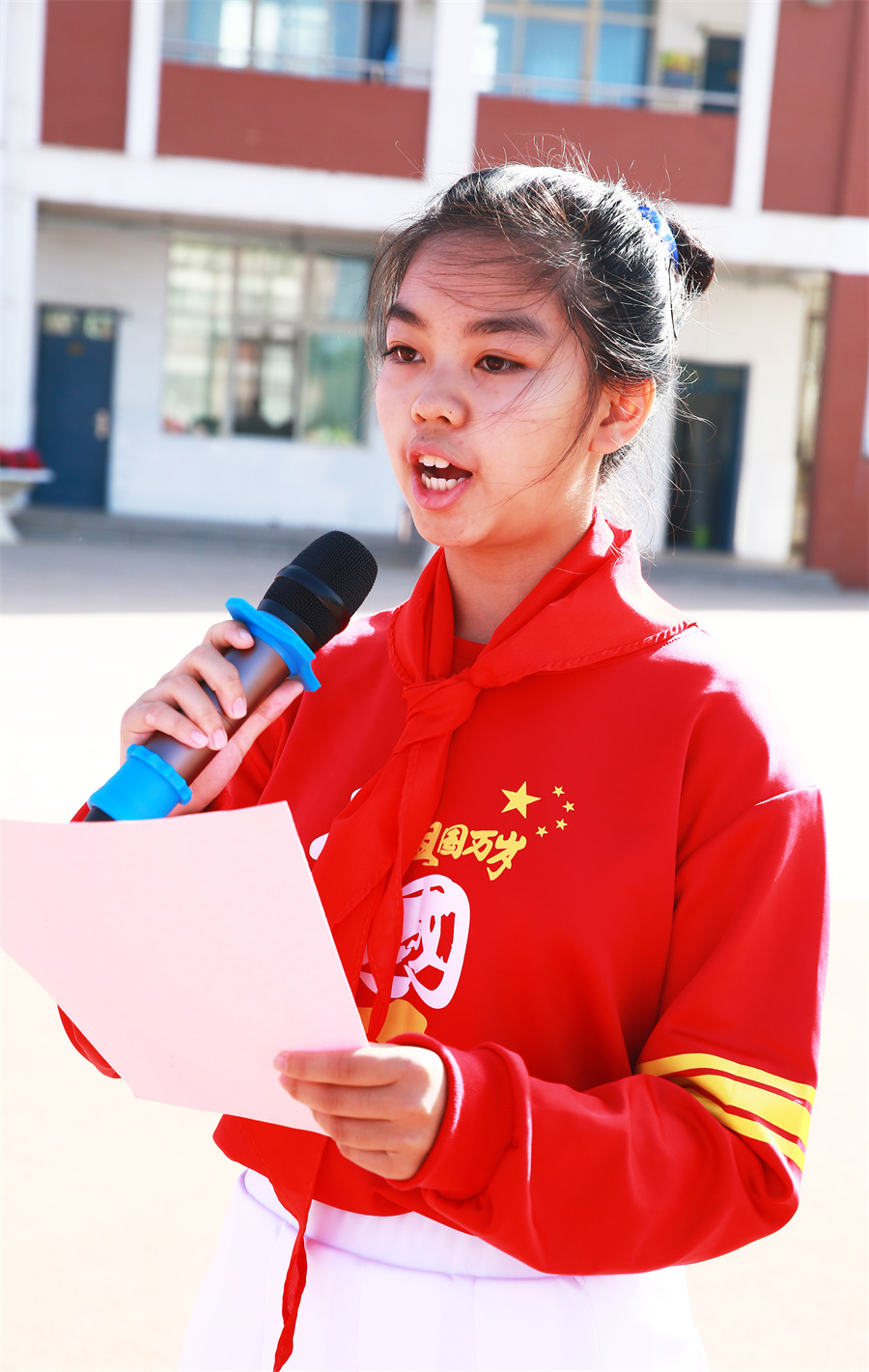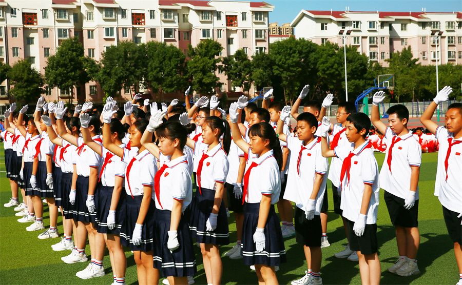 少(shǎo)先隊員,是紅色基因的傳承者。同學們要積極學習各種本領,提升自身素質,為(wèi)将來(lái)建設祖國打下堅實基礎。圖為(wèi)少(shǎo)先隊員獻詞。
