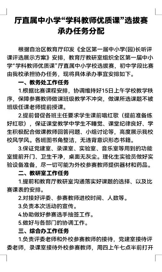 按照自治區教育廳的統一部署,我校于9月15日承辦了教育廳教研室組織的全區第一屆中小(xiǎo)學教師(shī)課堂教學“四課”比賽廳直屬優質課選拔賽。