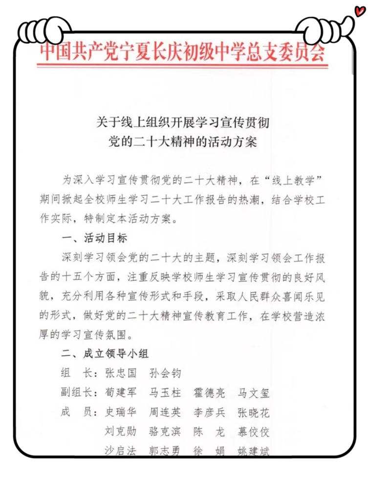 10月16日,黨的二十大(dà)在人(rén)民大(dà)會(huì)堂隆重開(kāi)幕,神州一片歡欣鼓舞。甯夏中衛中學廣大(dà)師(shī)生懷着激動的心情,以不同形式認真收聽(tīng)收看了黨的二十大(dà)開(kāi)幕會(huì)盛況,聆聽(tīng)習近平同志(zhì)代表第十九屆中央委員會(huì)向大(dà)會(huì)作的報告。學校黨總支第一時(shí)間(jiān)做出了《關于線上(shàng)組織開(kāi)展學習宣傳貫徹黨的二十大(dà)精神的活動方案》,各黨支部、各部門(mén)積極響應,掀起了長慶初中學習二十大(dà)精神的熱潮。