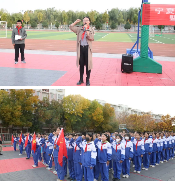 第六項:全體(tǐ)少(shǎo)先隊員嚴肅安靜,目光如炬,跟随機關後勤黨支部宣傳委員、初一年級部主任徐娟同志(zhì)高(gāo)聲呼号:“準備着:為(wèi)共産主義事業而奮鬥”。全體(tǐ)少(shǎo)先隊員莊嚴肅穆齊聲回答(dá),“時(shí)刻準備着!”