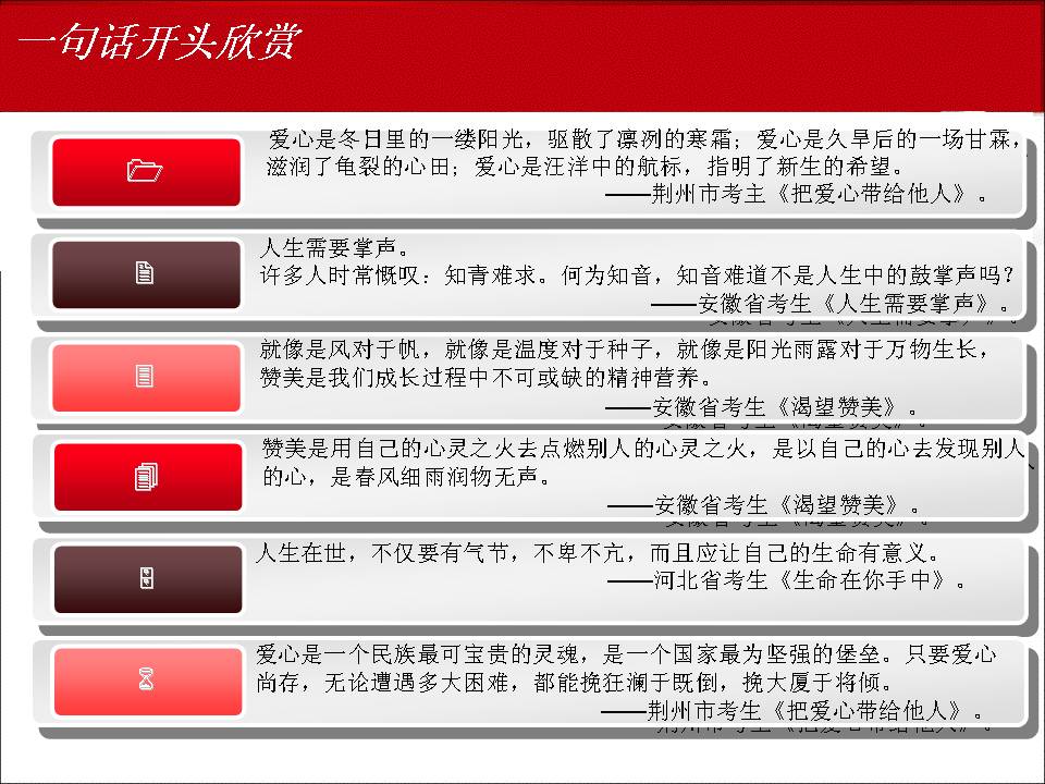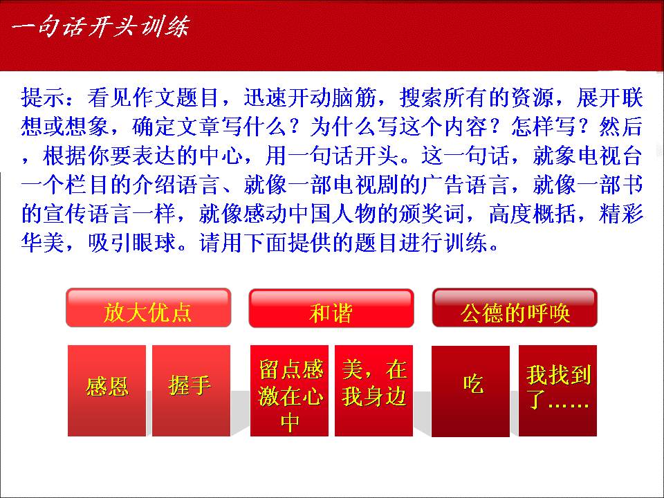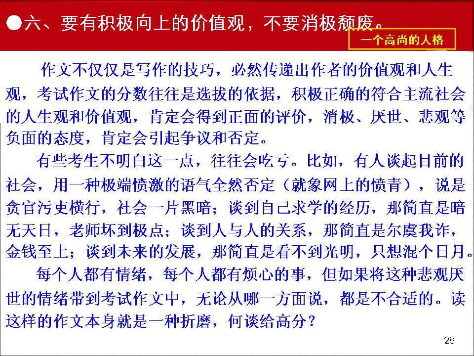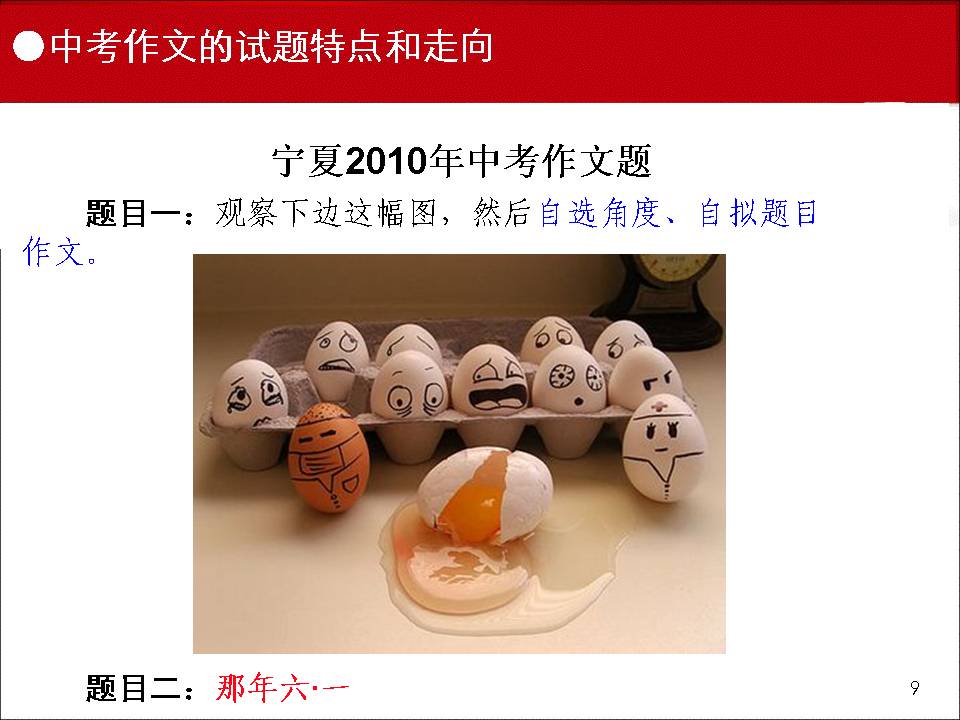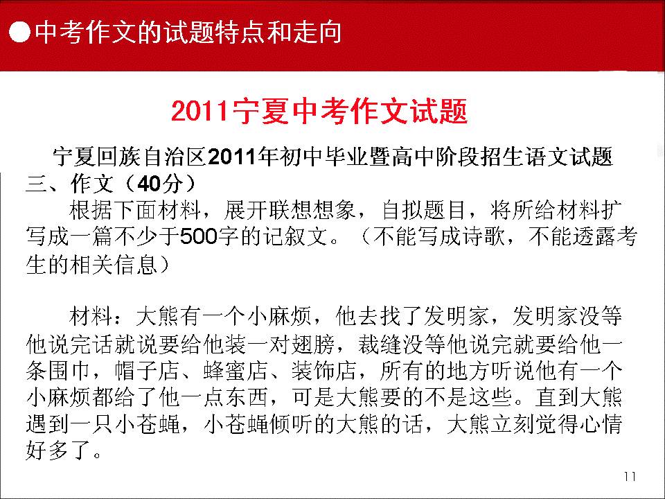 9月19--20日,2011年甯夏回族自治區語文學科中考研討(tǎo)會(huì)在銀川召開(kāi),大(dà)會(huì)由自治區語文教研員李澤琪老師(shī)主持,區教研室主任賀宏炜、副主任許燕萍、夏正建和(hé)小(xiǎo)龍人(rén)語文學習報總編黑(hēi)玉紅光臨會(huì)議,全區各地縣的語文教研員和(hé)各學校的初三備課組長200多(duō)人(rén)參加了會(huì)議。應會(huì)議的邀請(qǐng),我校賈生榮老師(shī)作了《中考作文試題分析及策略》的專題講座。現将該講座課件摘要發布。